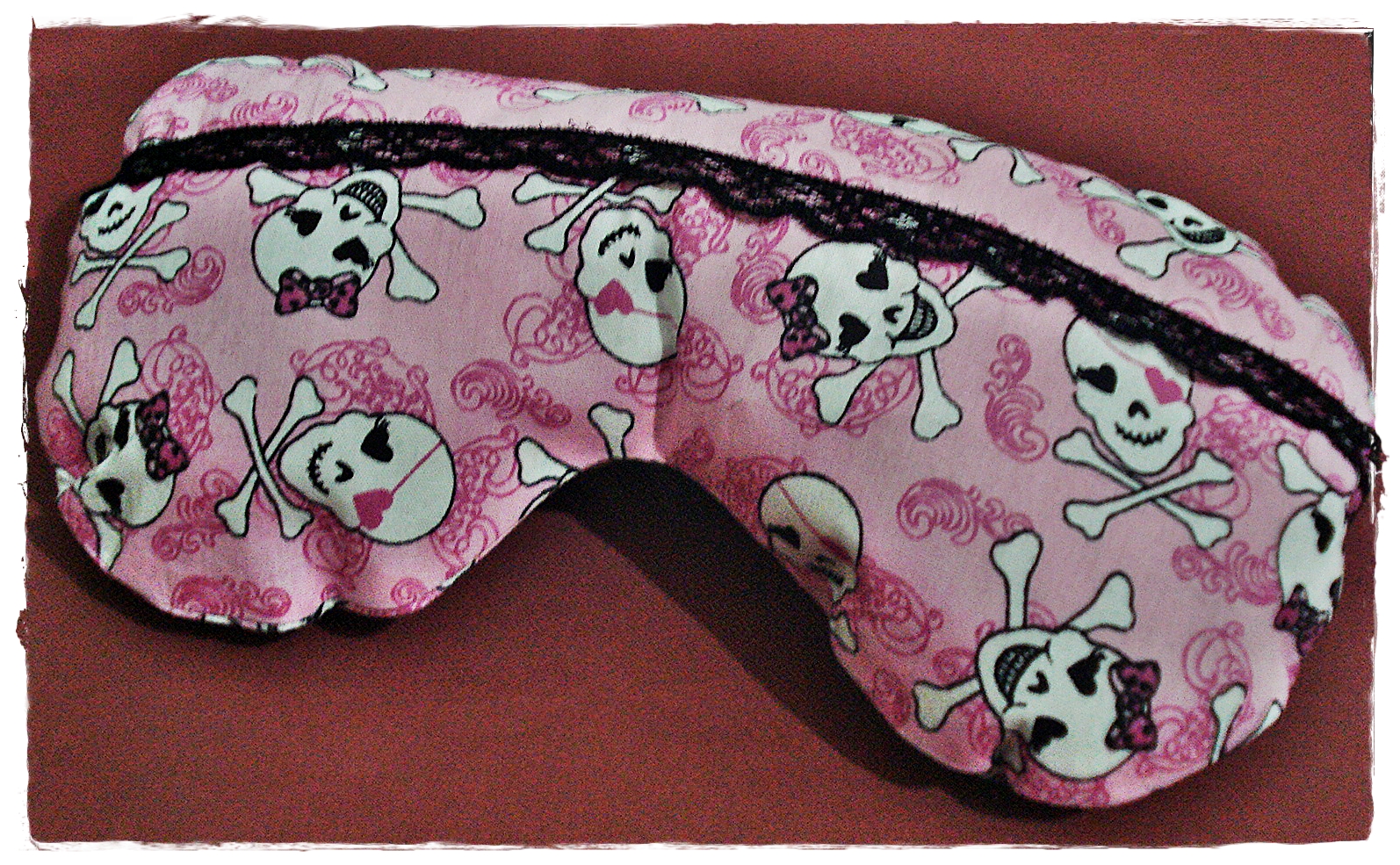 Linda e delicada máscara rosa com caveirinhas com aplicação em renda.
